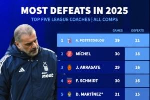 体育资讯10月9日讯 接替努诺成为诺丁汉森林主帅后,波斯特科格鲁未能提升球队表现,反而让球队进一步陷入泥沼。根据德国转会市场的统计,波斯特科格鲁是五大联赛今年输球最多的主教练,达到了21场,而曼联主帅阿莫林以15场并列第4。
