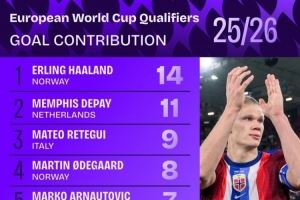 体育资讯10月15日讯 Squawka统计了本届欧洲世预赛球员参与进球(助攻+进球)的数量,并列出榜单,哈兰德参与14球居首,德佩参与11球次席。
