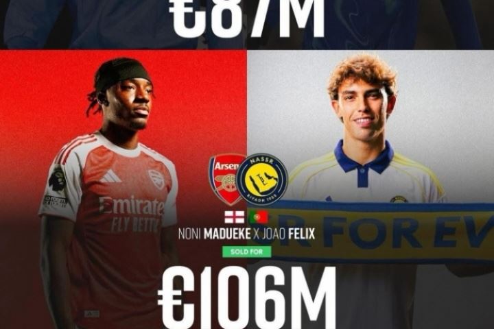 2023年1月和2024年8月,切尔西先后签下马杜埃凯、菲利克斯,转会费分别为3500万欧元、5200万欧元,合计8700万欧。